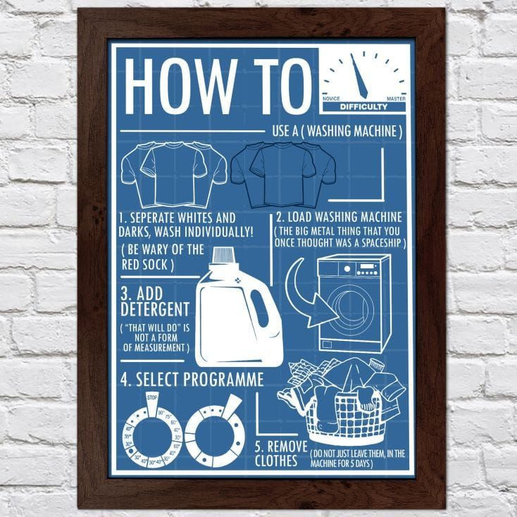 What a fantastic infographic kitchen poster! Humorous and informative, our 'How to' Washing Machine Poster will brighten up the heart of your home. It is available in A4 and A3 sizes and as a standard print or mounted in one of our 5 fabulous wood effect frame. Housework seems to baffle some people