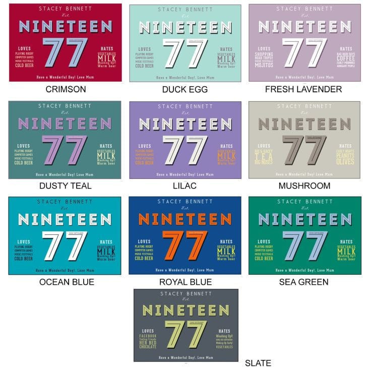 Then comes the fun part….first decide on the colour scheme (there are 10 to choose from, so you shouldn’t struggle trying to find a colour to suit), then you can provide their date of birth if you wish (which will be positioned inside the second digit) and then list up to 4 things they ‘Love’ and up to 4 things they ‘Hate’ – which might test just how much you know them! You can also finish of this stylish poster off with a message – perfect for adding your wonderful 40th Birthday wishes – be they witty or sentimental.